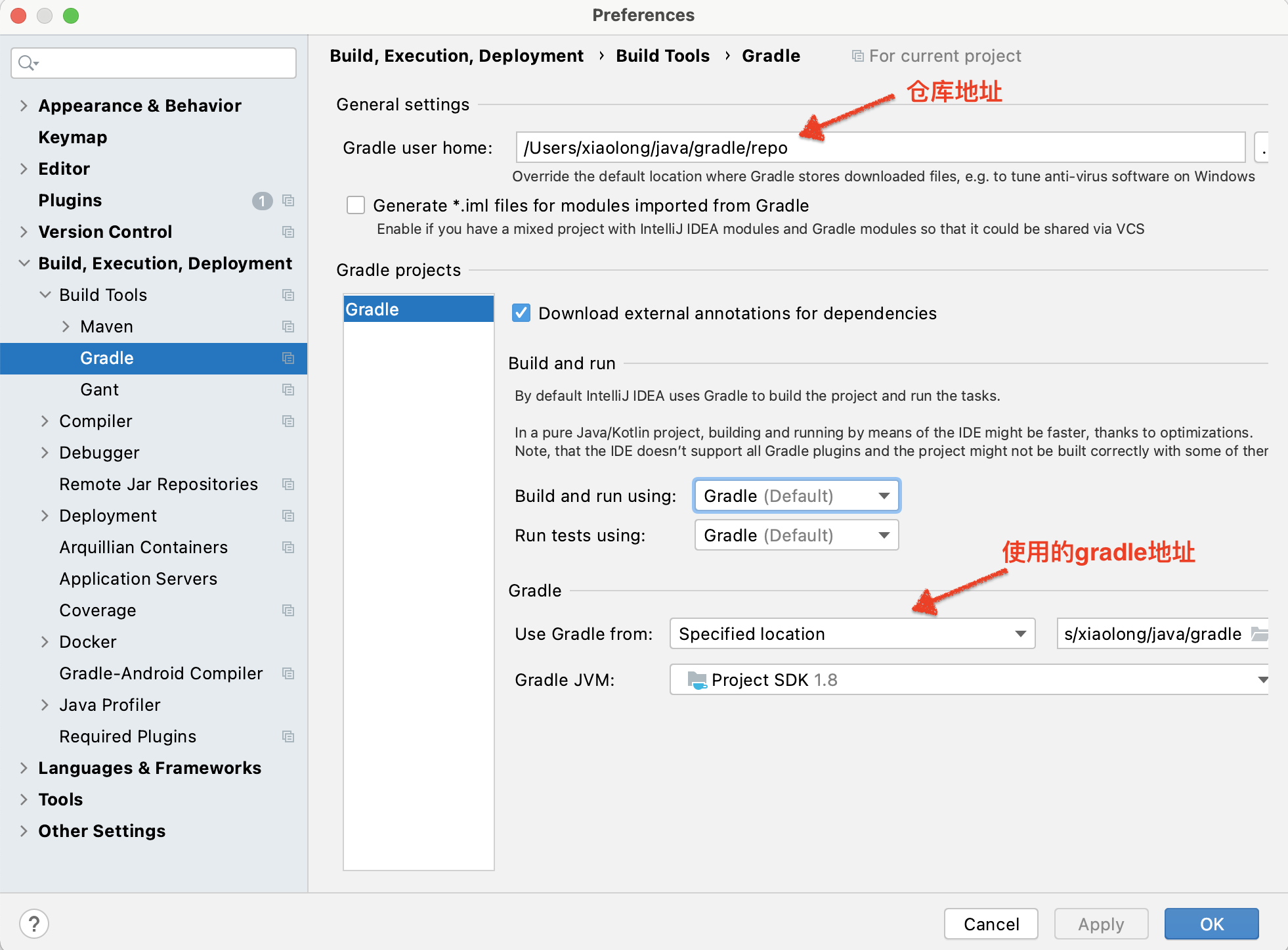 GRADLE_USER_HOME=/Users/...,后面的值就是仓库的地址,这里可以直接写到maven的仓库。 - 打开idea中,在配置中查看如果仓库地址没有改变,将仓库地址修改